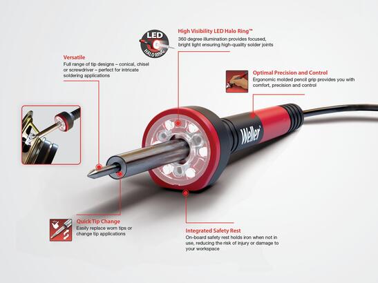 Solder skillfully and confidently with Weller's 30W Soldering Iron with LED Halo Ring™. With its 360 degree illumination, ergonomic molded pencil grip handle, easy-to-change tips, and integrated safety rest, it's the perfect high-quality and versatile soldering iron for all your soldering needs.