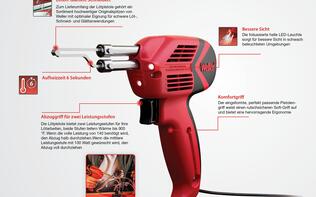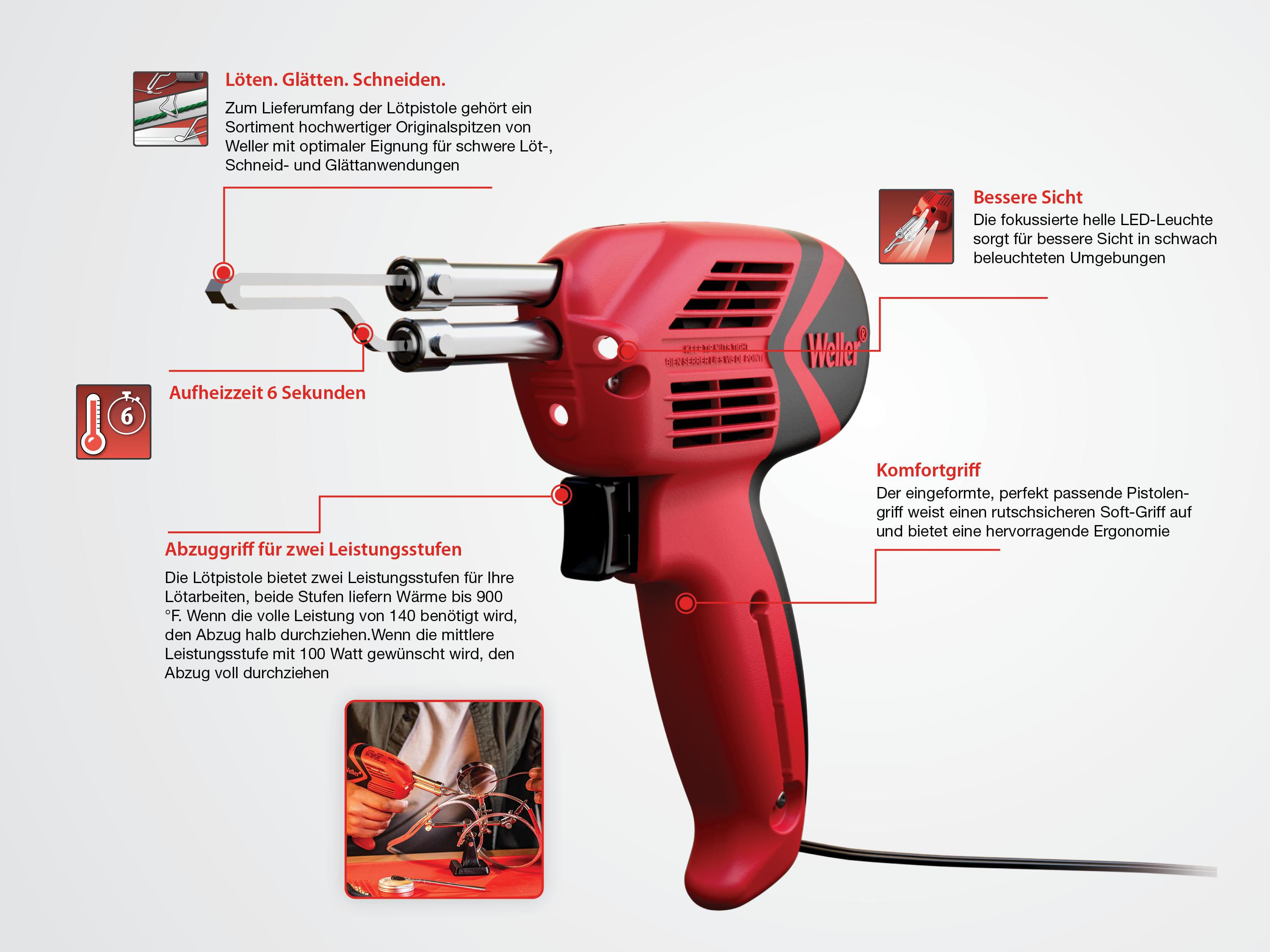 Die Lötpistole wird mit einem Sortiment hochwertiger Original-Weller-Spitzen geliefert, die optimal für schwere Löt-, Schneid- und Glättungsarbeiten geeignet sind.