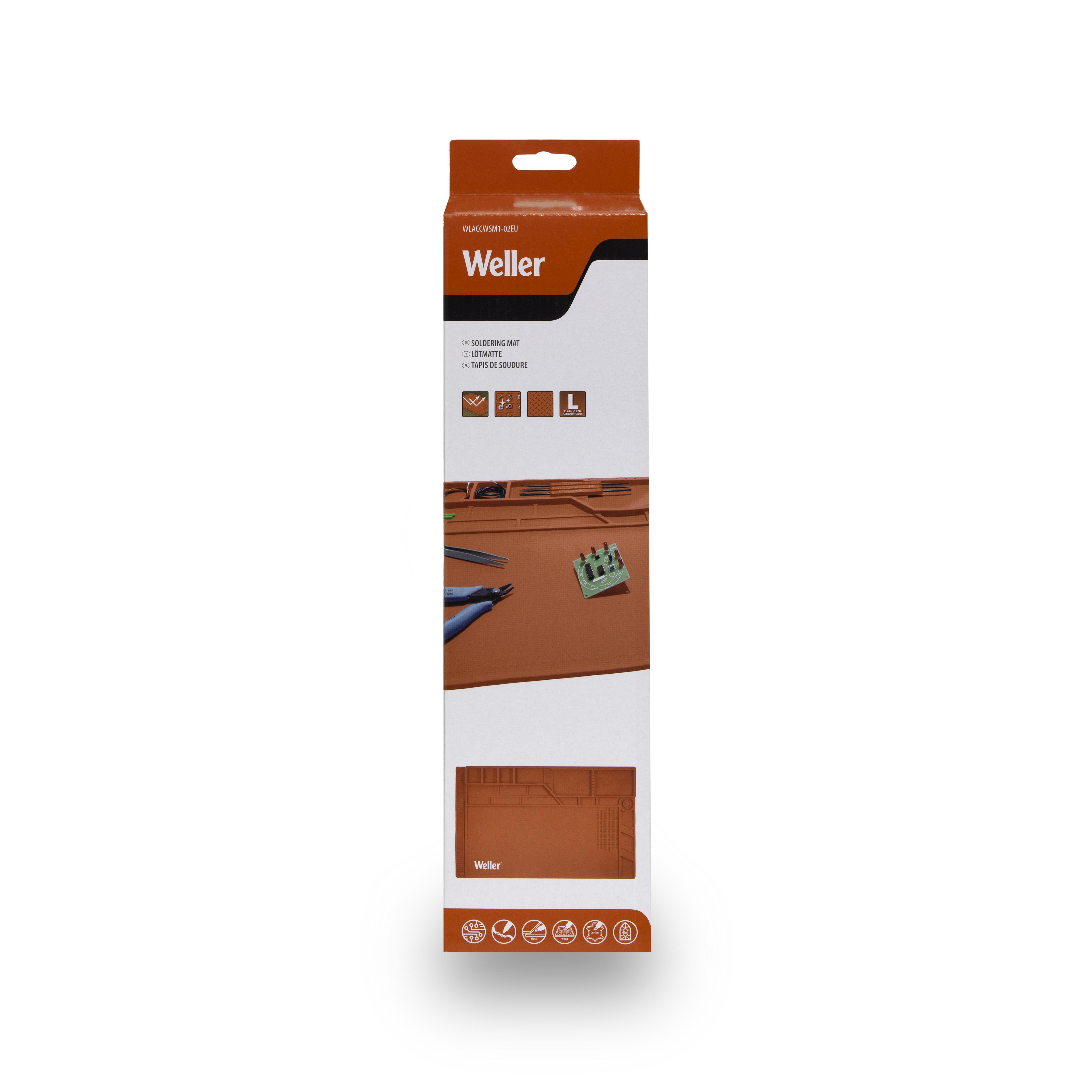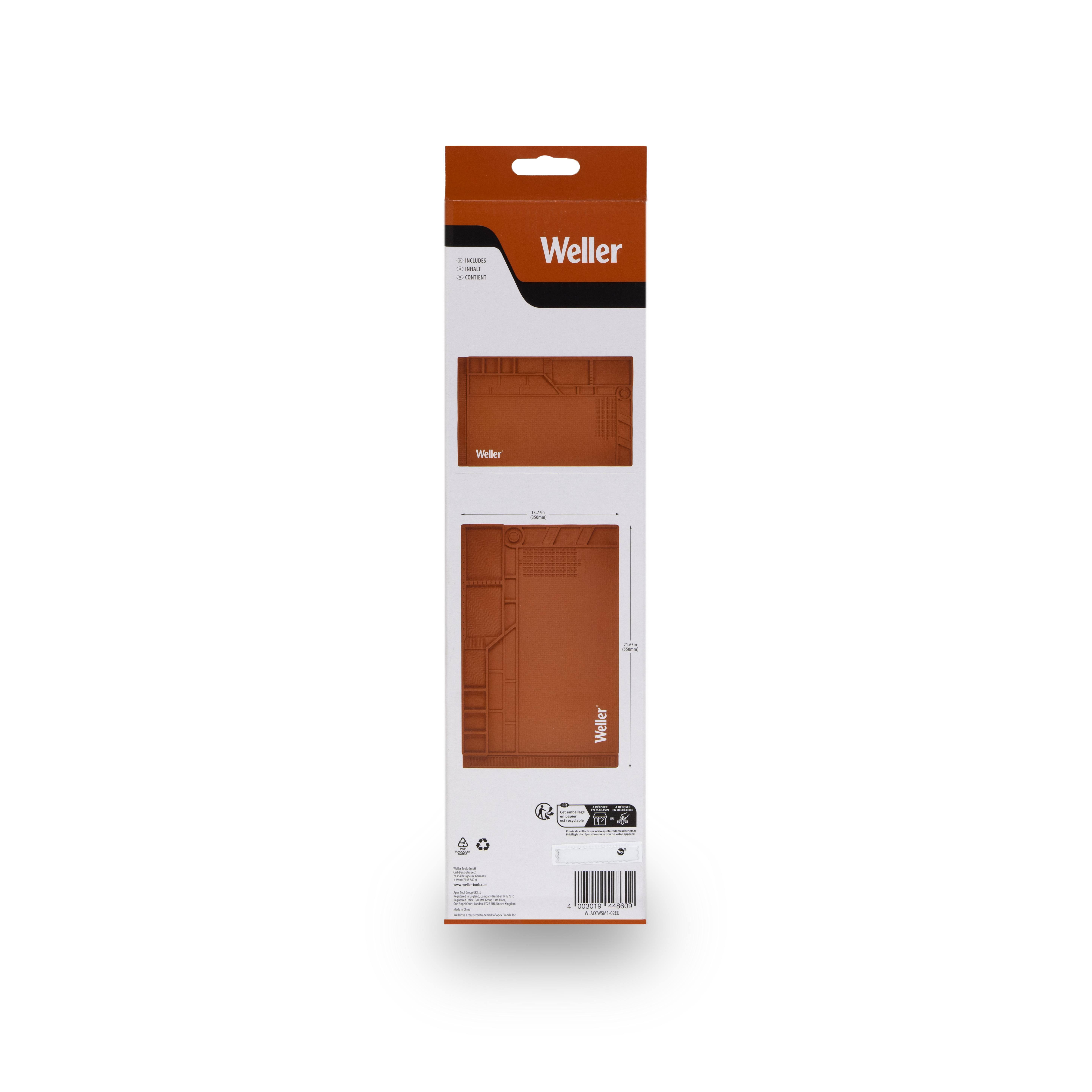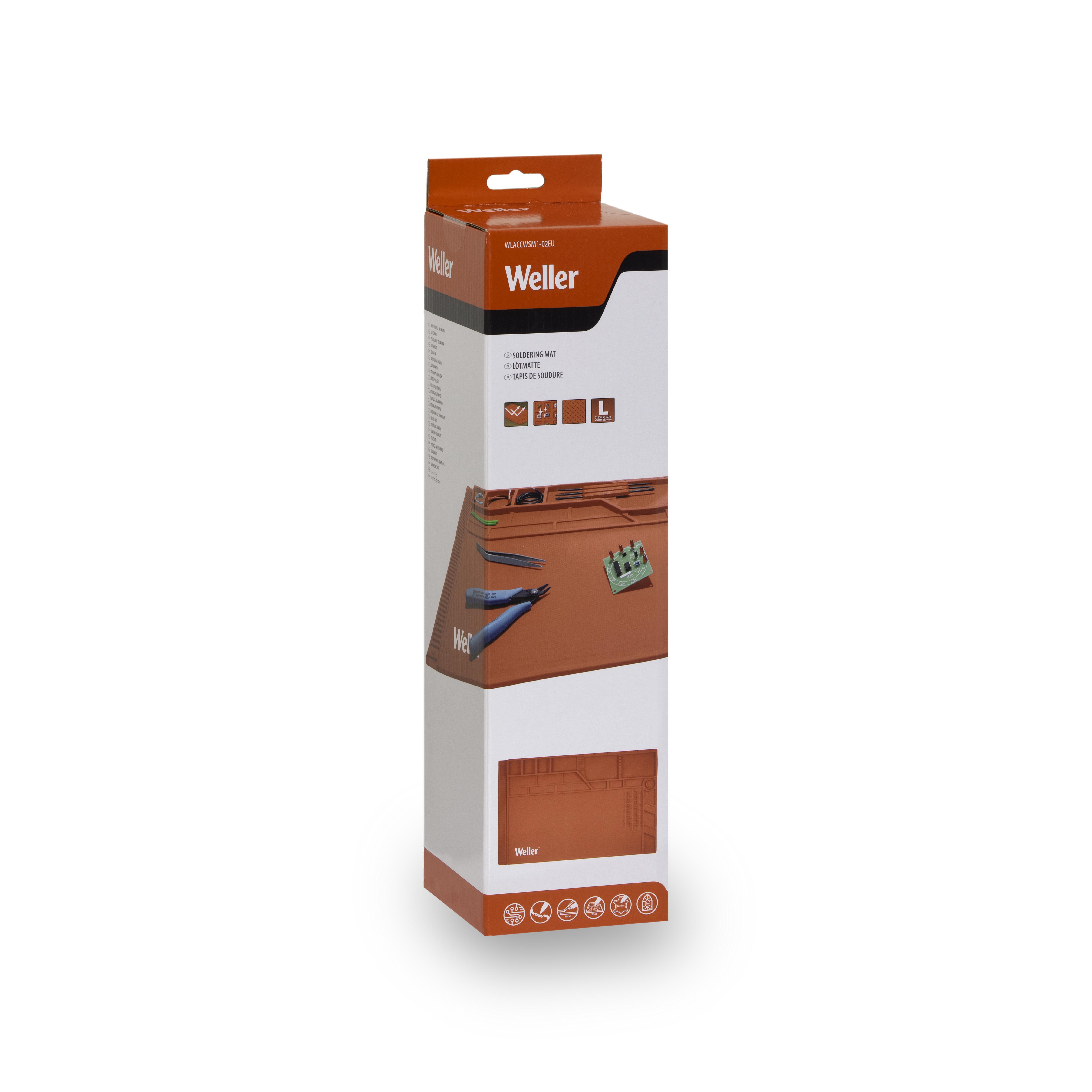 Schützen Sie Ihre Oberfläche mit der großen Lötarbeitsplatzmatte von Weller. Die rutschfeste Silikonmatte ist hitzebeständig und sorgt für einen sauberen und aufgeräumten Arbeitsplatz. Enthält ein Lineal, einzelne Fächer und vier magnetische Ablageflächen.
