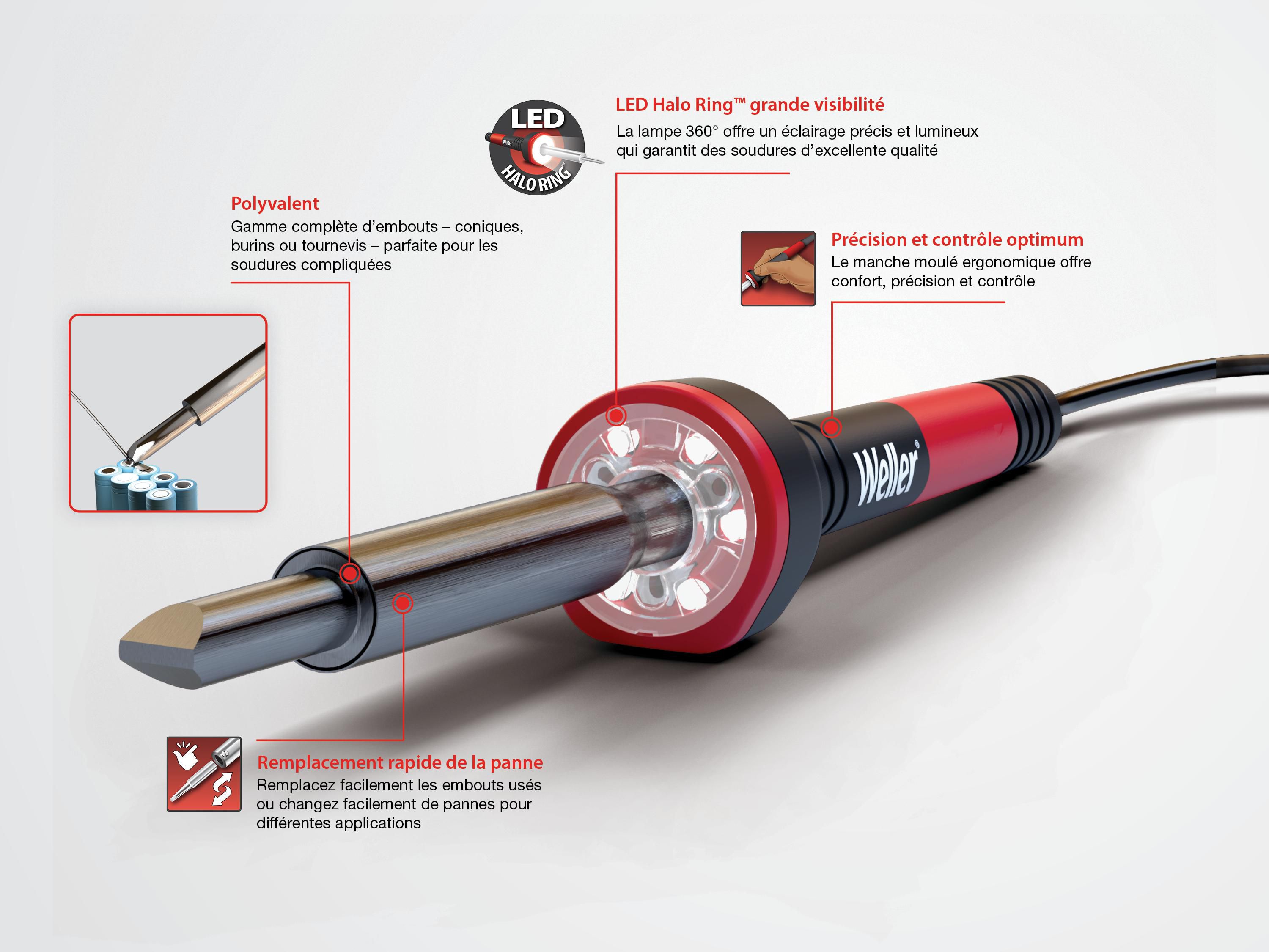 Soudez en toute sécurité et fermement avec le fer à souder 80 W avec son grip de maintien. Avec son manche ergonomique pour des soudures confortables en continu, ses embouts faciles à changer et son support de sécurité intégré, ce fer à souder d'excellente qualité est parfaitement polyvalent et répond à tous vos besoins de soudure