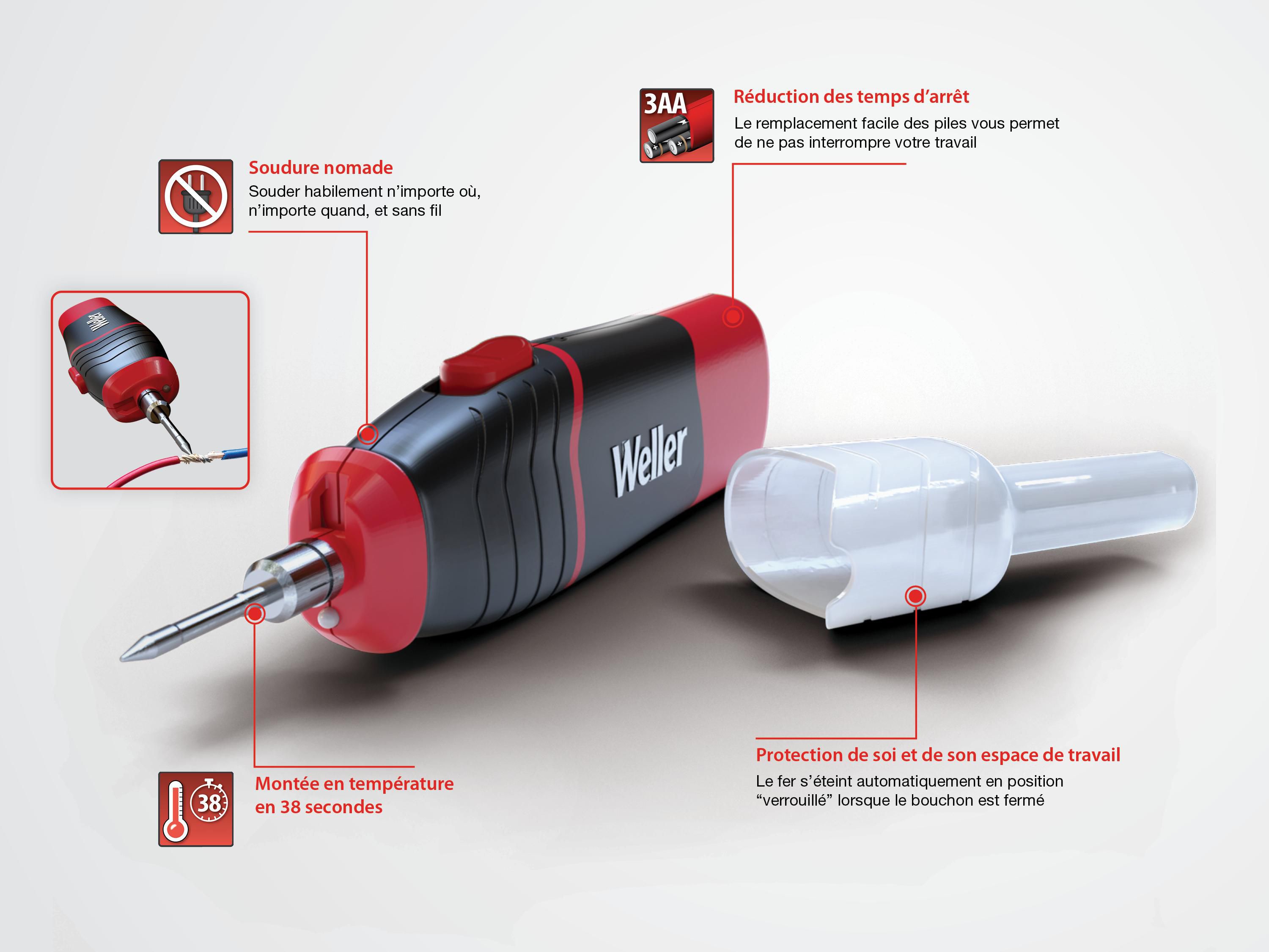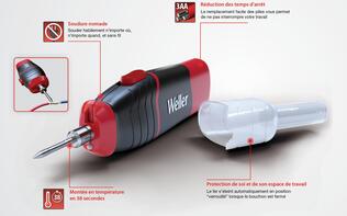 Soudure nomade avec le fer à souder sans fil Weller. L'alimentation par pile AA 4,5 W vous permet de réaliser vos soudures n'importe où, n'importe quand, et sans fil. Avec une montée en température en 38 secondes, une gamme complète de pannes et la possibilité de remplacer facilement les piles, il est l'outil idéal pour vos tâches de soudage.