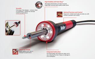 Solder skillfully and confidently with Weller's 30W Soldering Iron with LED Halo Ring™. With its 360 degree illumination, ergonomic molded pencil grip handle, easy-to-change tips, and integrated safety rest, it's the perfect high-quality and versatile soldering iron for all your soldering needs.