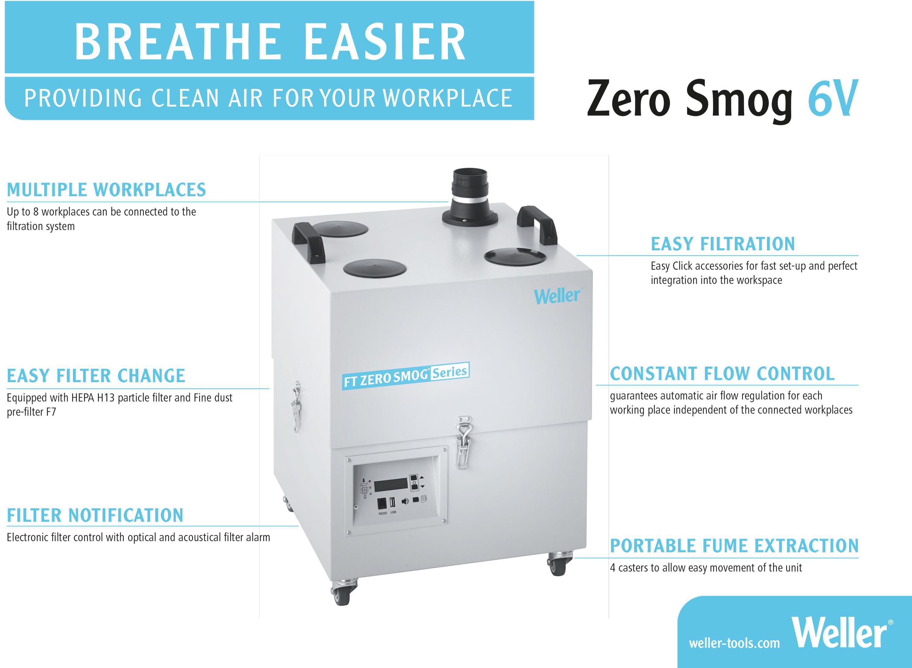 The Zero Smog 6V fume extraction unit is easy to install and operate. It is designed for use as a centralised system. A powerful, maintenance-free turbine provides continuous fume extraction at a maximum air extraction rate of 615m3/h. With constant flow control the turbine speed is automatically adjusted to demand, avoiding unnecessary waste of suction power resulting in energy savings.