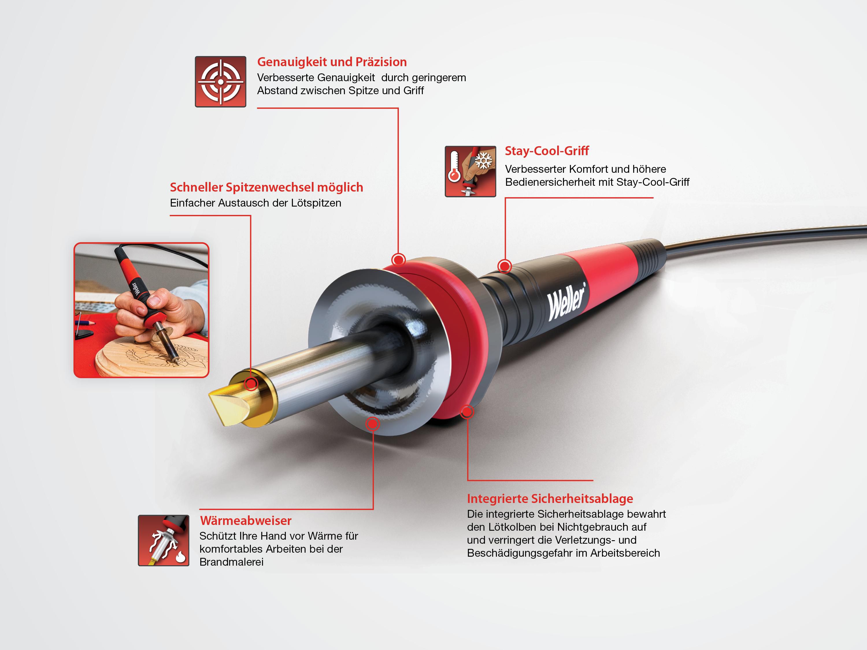 Il kit WLIWBK2523C da 15 pezzi per progetti di pirografia ispira la creatività con tutto ciò che occorre per iniziare il tuo viaggio nell'hobby della pirografia. La distanza ridotta tra la punta e l'impugnatura del pirografo Weller a stilo corto, consente una migliore accuratezza e una maggiore precisione su una grande varietà di supporti in legno e cuoio