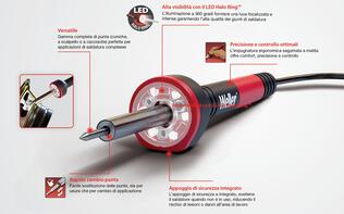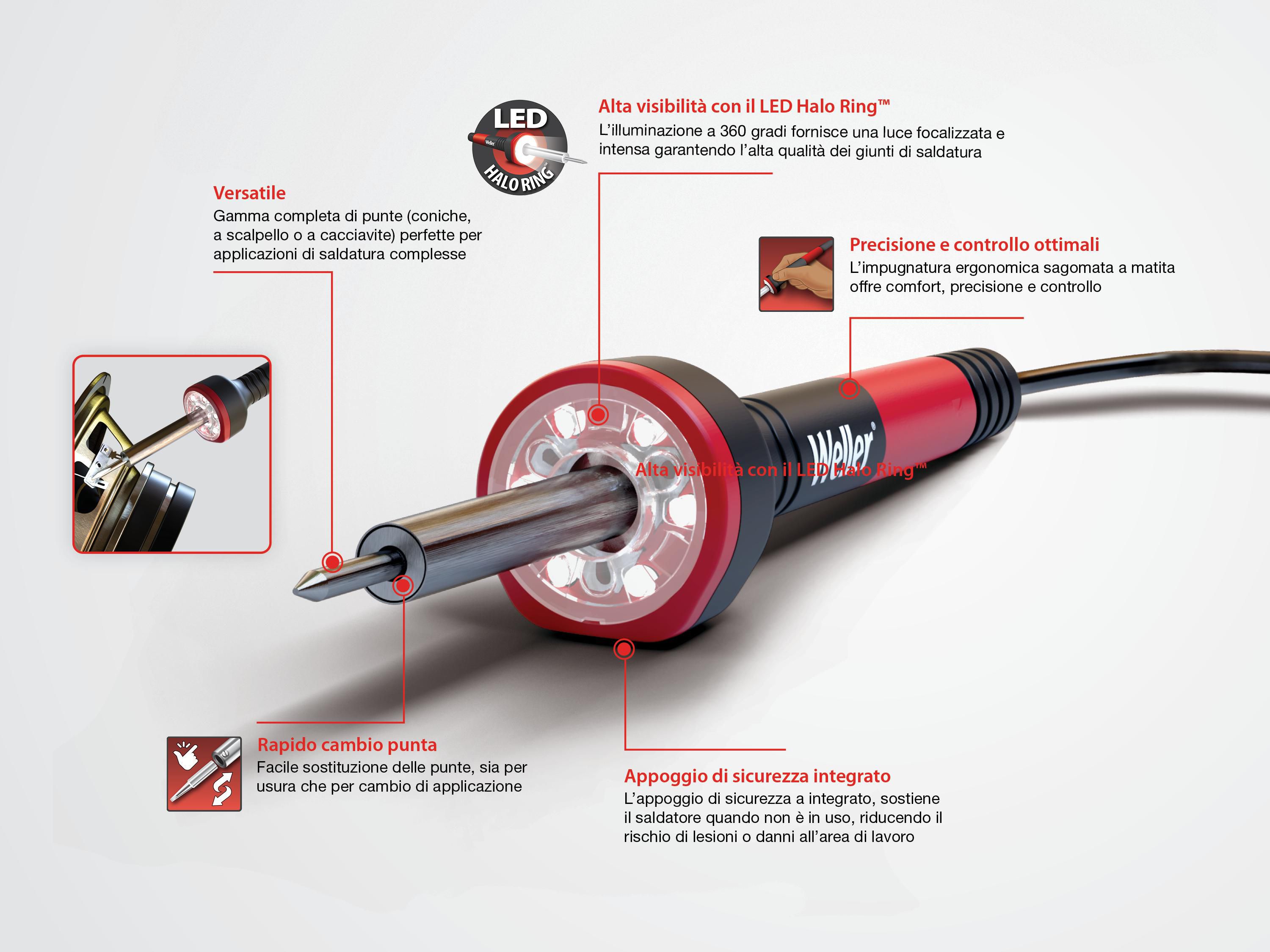 Salda con maestria e sicurezza con la stazione di saldatura Weller da 30 W con LED Halo Ring™. Dotato di illuminazione a 360 gradi, impugnatura ergonomica sagomata a matita, punte facili da cambiare e appoggio di sicurezza integrato, è il saldatore versatile e di alta qualità perfetto per tutte le esigenze di saldatura.