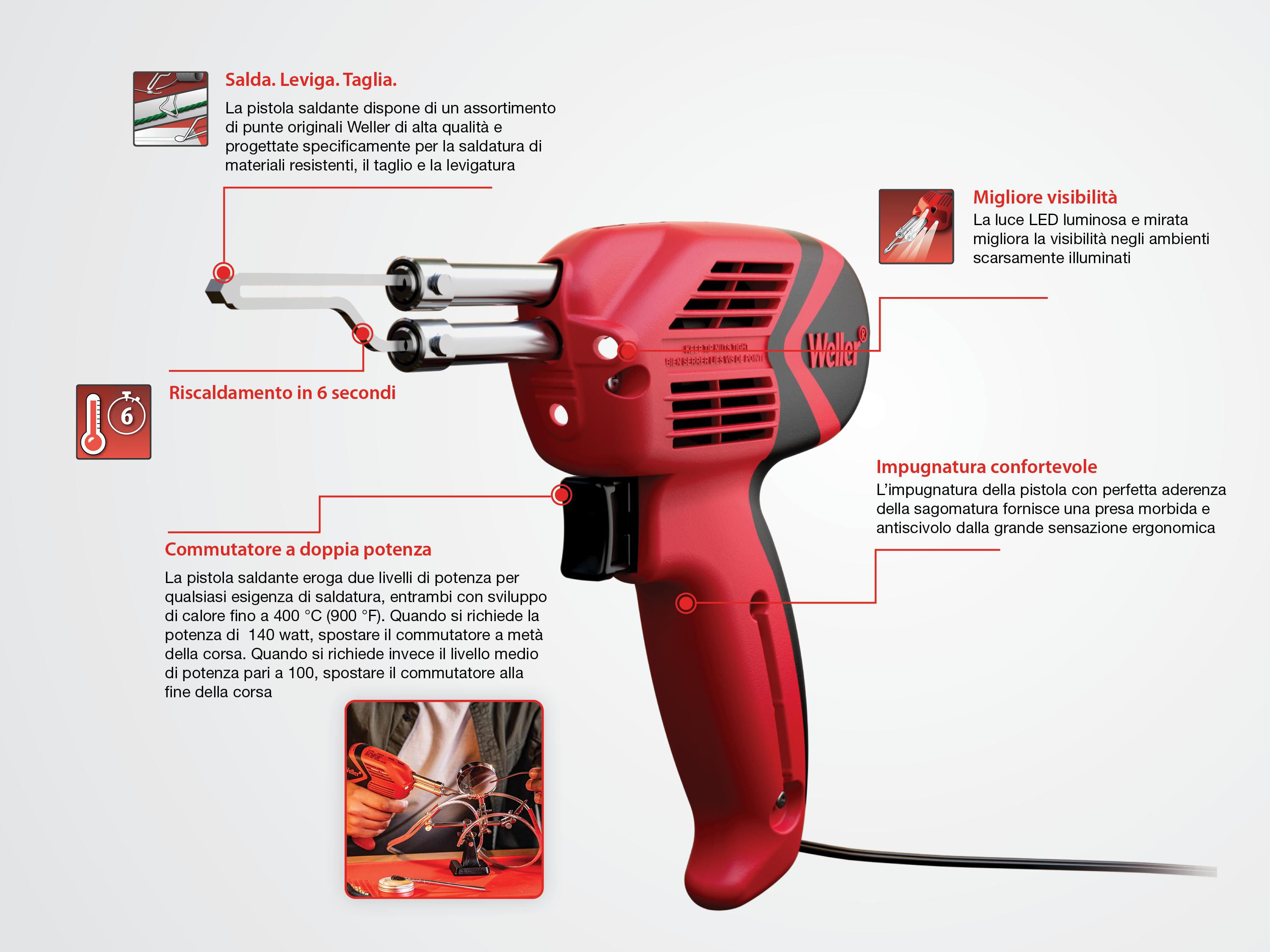La pistola saldante eroga due livelli di potenza per qualsiasi esigenza di saldatura, entrambi con sviluppo di calore fino a 400 °C (900 °F). Quando si richiede la potenza di 140 watt, spostare il commutatore a metà della corsa. Quando si richiede invece il livello medio di potenza pari a 100, spostare il commutatore alla fine della corsa.