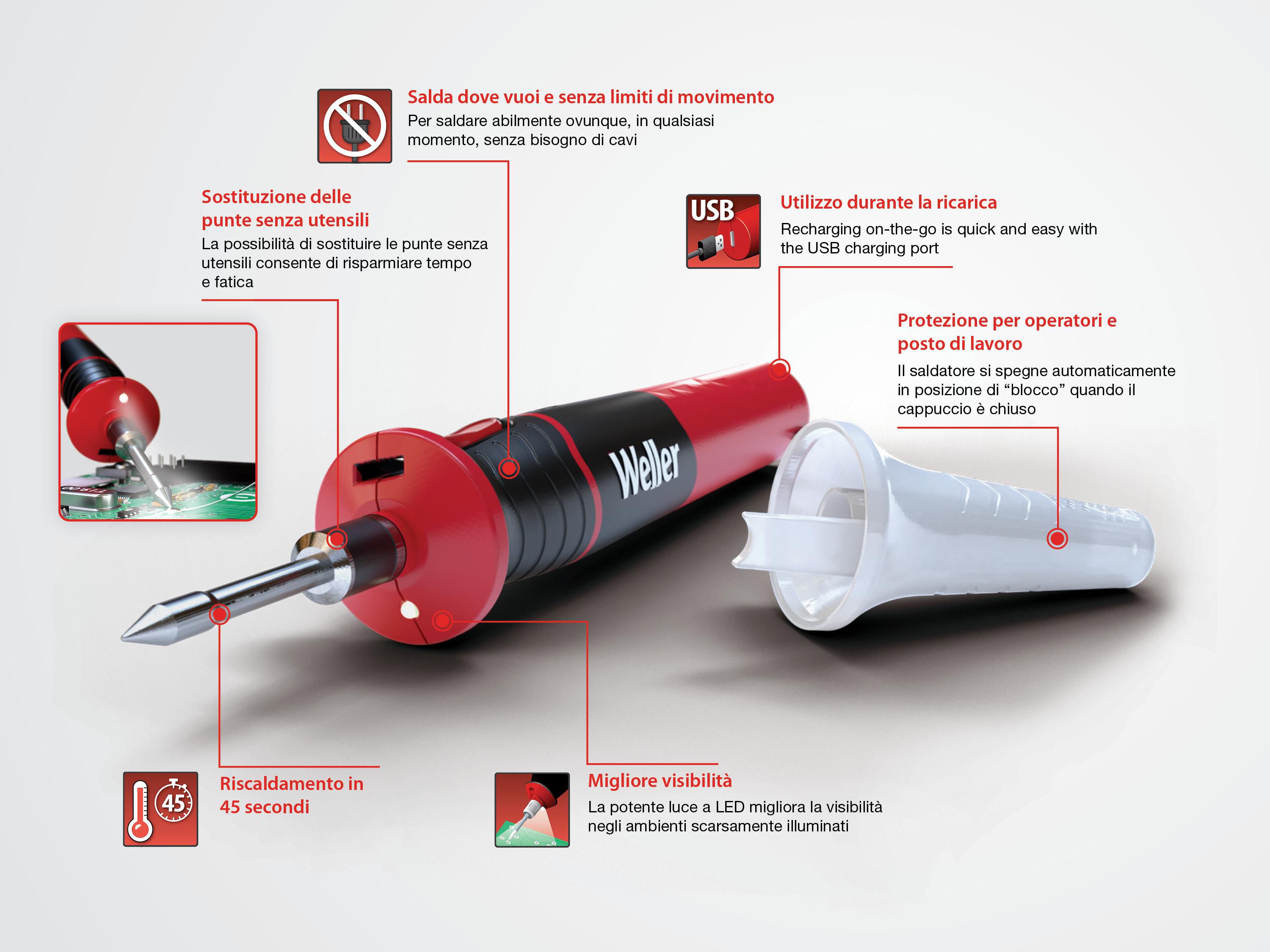 Salda dove vuoi e senza limiti di movimento con il saldatore cordless e ricaricabile Weller. La batteria agli ioni di litio da 12 W consente di utilizzare il saldatore mentre viene ricaricato, così da non dover mai interrompere il lavoro. Grazie alla capacità di riscaldarsi in 45 secondi, alla luce a LED, allo spegnimento automatico e all'appoggio di sicurezza integrato, è lo strumento perfetto per ogni esigenza di saldatura.