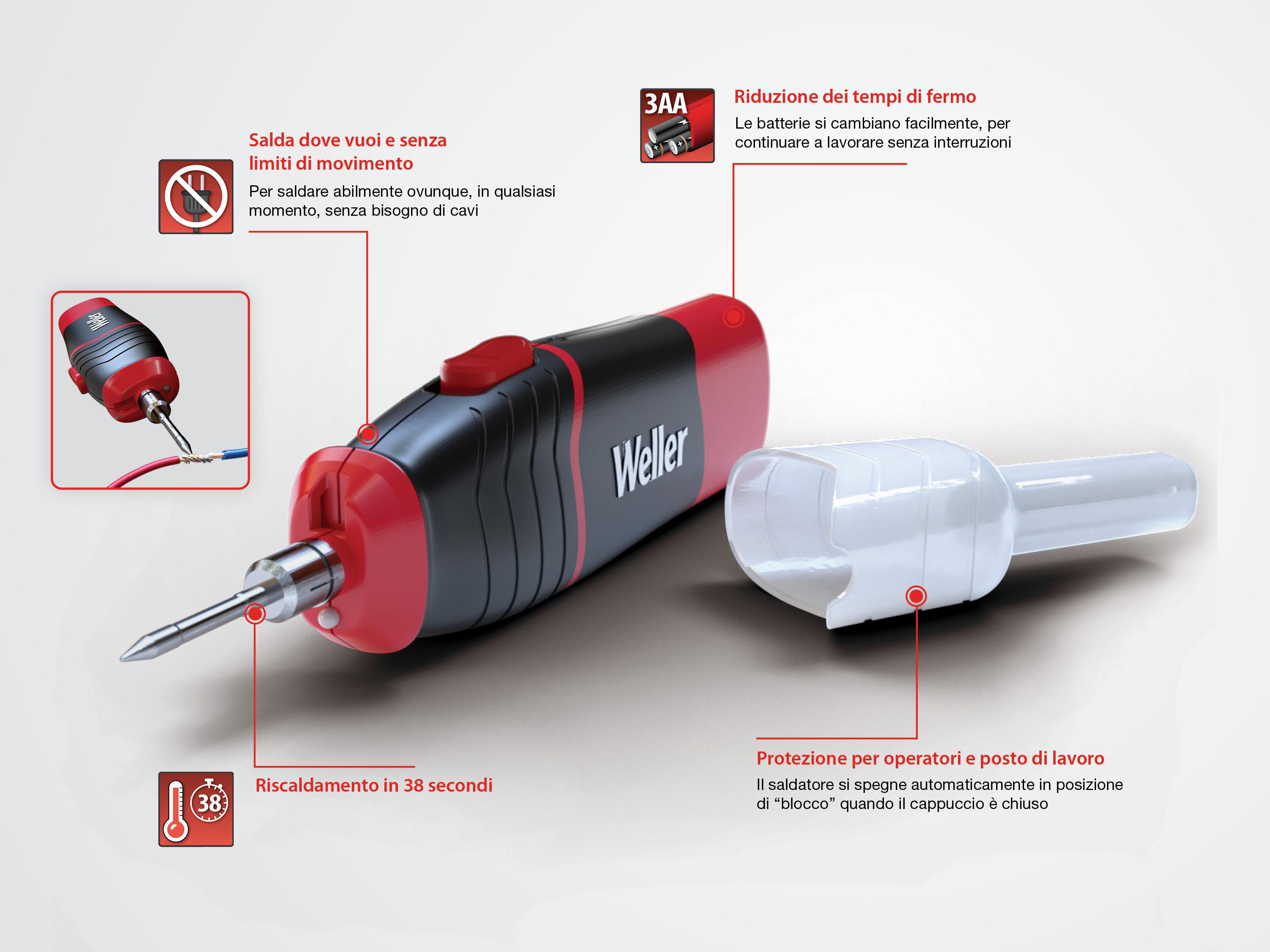 Salda dove vuoi e senza limiti di movimento con il saldatore cordless Weller. L'alimentazione a batterie AA da 4,5 W consente di saldare ovunque, in qualsiasi momento, grazie alla funzionalità cordless. Grazie alla capacità di riscaldarsi in 38 secondi e alla sostituzione rapida delle batterie, è lo strumento perfetto per ogni esigenza di saldatura.