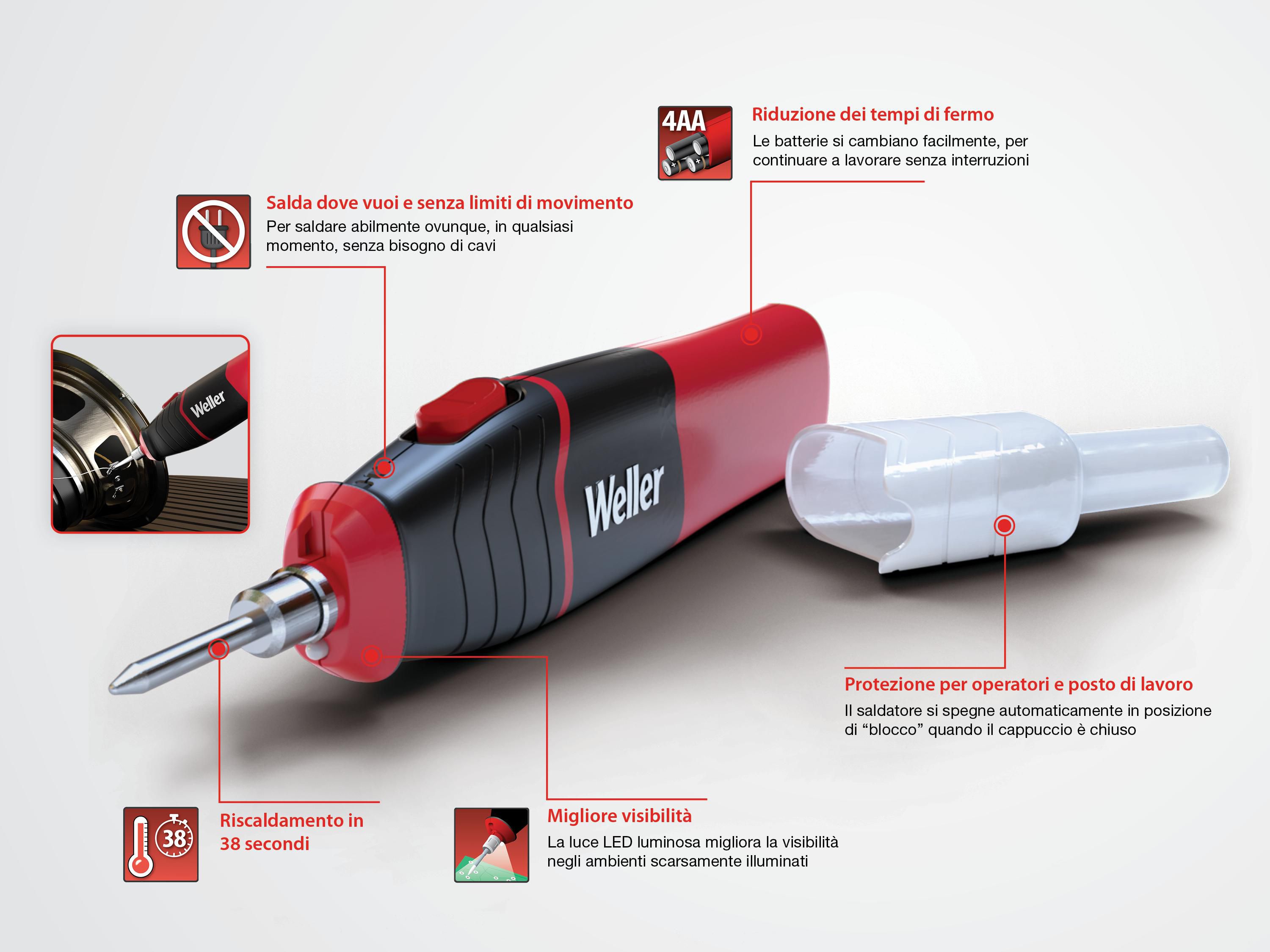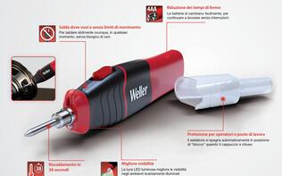 Salda dove vuoi e senza limiti di movimento con il saldatore cordless Weller. L'alimentazione a batterie AA da 6 W / 8 W consente di saldare ovunque, in qualsiasi momento, per mezzo della funzionalità cordless. Grazie alla capacità di riscaldarsi in 38 secondi, alla gamma completa di punte e alla sostituzione rapida delle batterie, è lo strumento perfetto per ogni esigenza di saldatura.