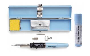Il saldatore a gas butano Weller Pyropen Piezo è un saldatore ad accensione automatica con funzioni di saldatura e soffio di aria calda. L'utensile si riscalda rapidamente e la carica di butano può durare fino a 3 ore. È ideale per saldature in movimento e consente di operare ovunque, senza bisogno di prese elettriche e senza intralci di cavi. La temperatura è regolabile tra 250 °C e 500 °C per la funzione di saldatore e fino a 650 °C per il soffio di aria calda. Grazie all'accensione piezoelettrica, il saldatore Weller Pyropen può essere acceso comodamente senza bisogno di ulteriori attrezzi.
