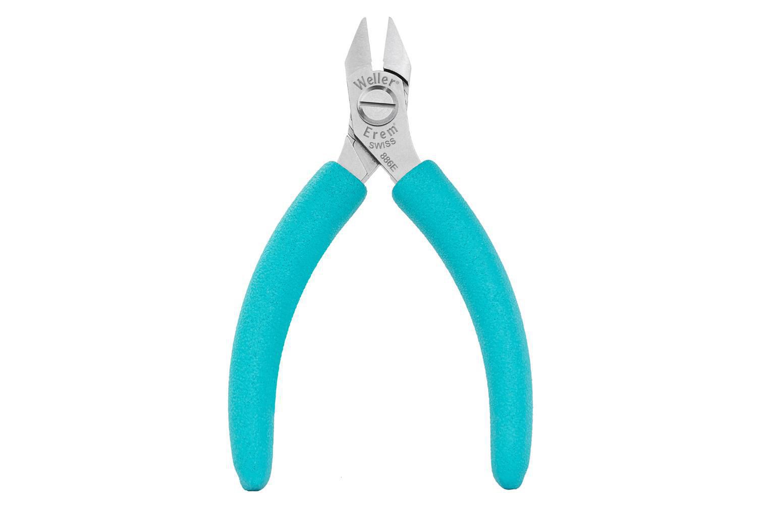 Weller Erem Series 800 Maxi rappresenta una gamma di tronchesi di precisione di formato maxi per applicazioni di taglio generiche in campo elettronico, per il taglio di fili di grande diametro. I tronchesi sono realizzati in acciaio per utensili di qualità superiore, e dotati di bordi taglienti con una durezza pari a 63-65HRc. I tronchesi di precisione presentano una superficie non riflettente e sono, inoltre, a prova di ESD e riaffilabili.