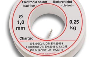 The Weller electronic solder EL99/1-250 with 1 mm diameter on a 250 g spool, lead-free solder. It is suitable for all soldering work in electrical engineering, miniature technology and on printed circuits. S-Sn99Cu1, DIN EN 29453 (Sn99,3Cu0,7). 2.2% flux according to DIN EN 29454, 1.1.2.B (EN 6190-ROM1)