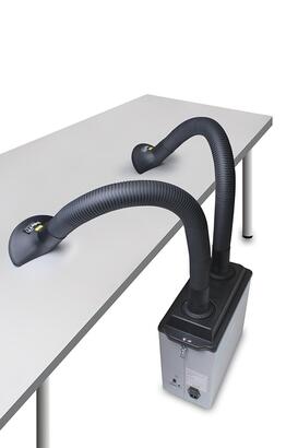 • The fume extraction kit is easy to install and operate. It is supplied complete with 2 off flexible extraction arms (1m long) and 2 off ESD ALFA Nozzles. The extraction arms fix directly to the unit which is placed close to the workbench.