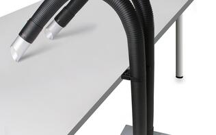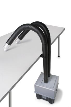 Fume extraction unit with 2 flexible extraction arms, 2 fixing clamps for the arms, a remote switch and 2 sloped nozzles