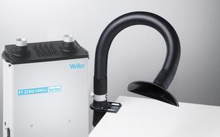The MG 100S kit 1 is delivered with a 1m flexible extraction arm, funnel nozzle and valve. The fume extraction unit is suitable for applications with a high demand of gases. Variable speed and alarm function for filter exchange can be set via the remote control. To make installation easier, the MG 100S can be suspended at the work table with special table mounting set (780-3001-ESD).