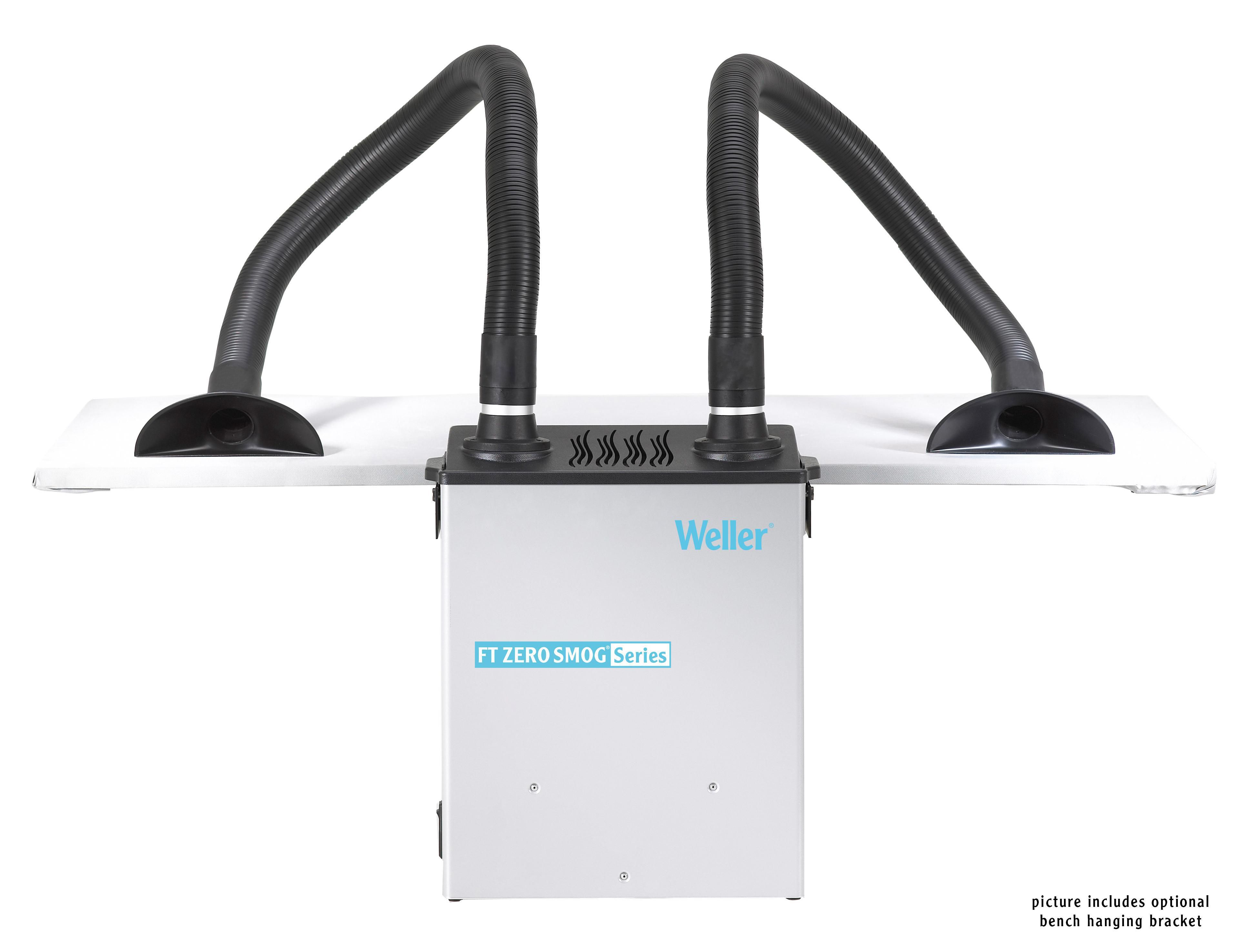 The MG 100S kit 2 will be delivered with 2 pcs. flexible extraction arm 1,5 meter, and 2 pcs. funnel nozzle. To make installation easier, the MG 100S can be suspended at the work table with special table mounting set (780-3001-ESD).The fume extraction unit is suitable for applications with a high demand of gases. Variable speed and alarm function for filter exchange can be set via the remote control.