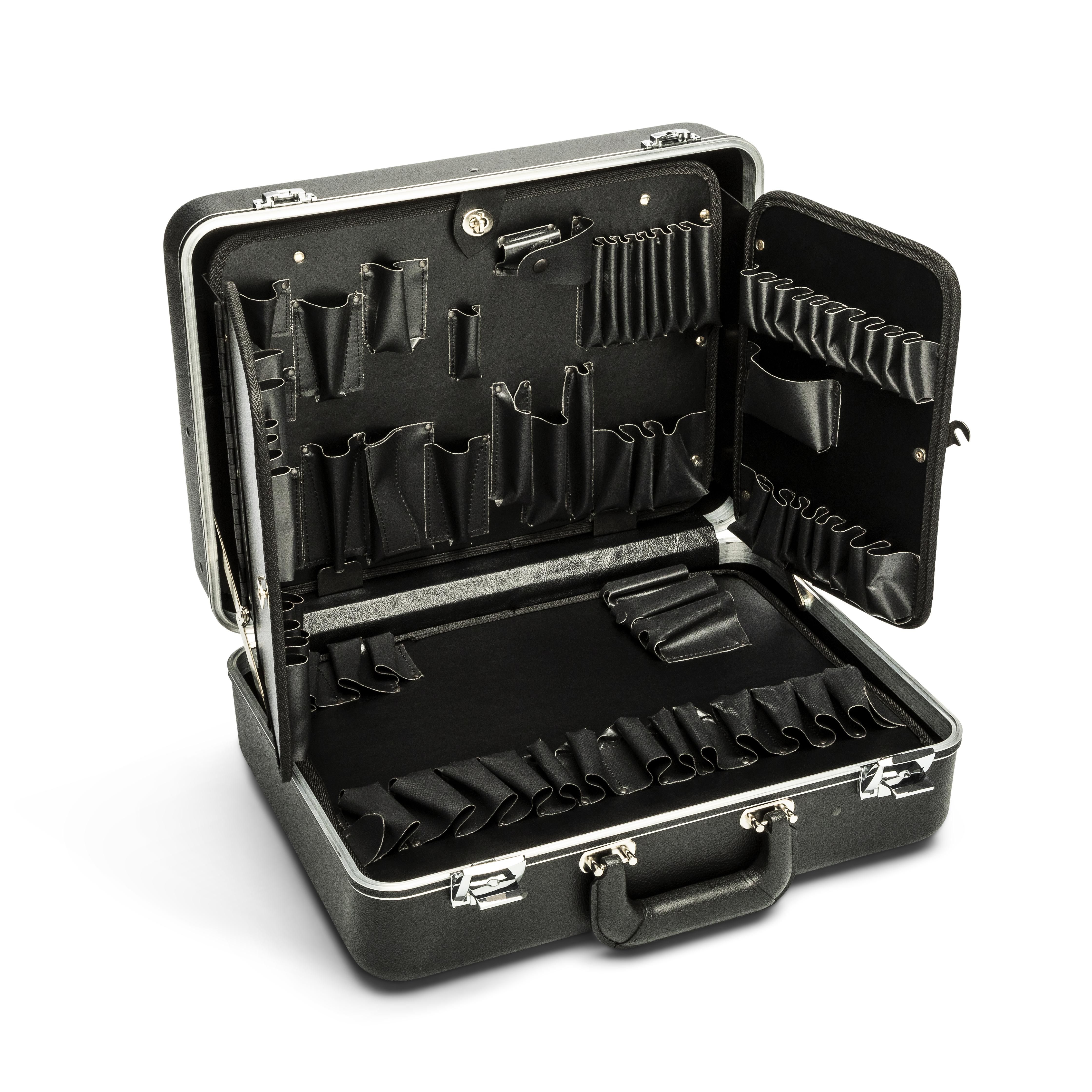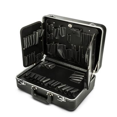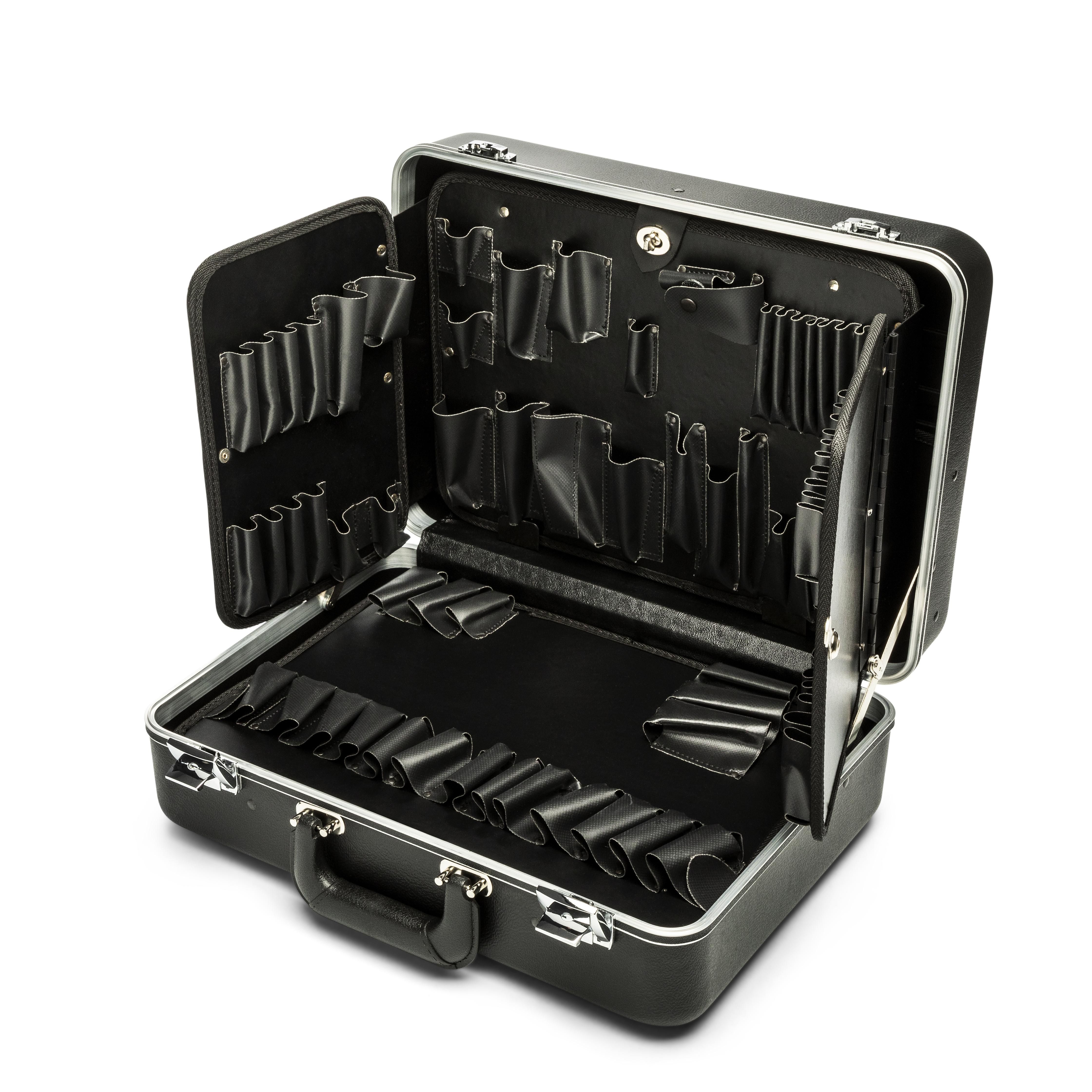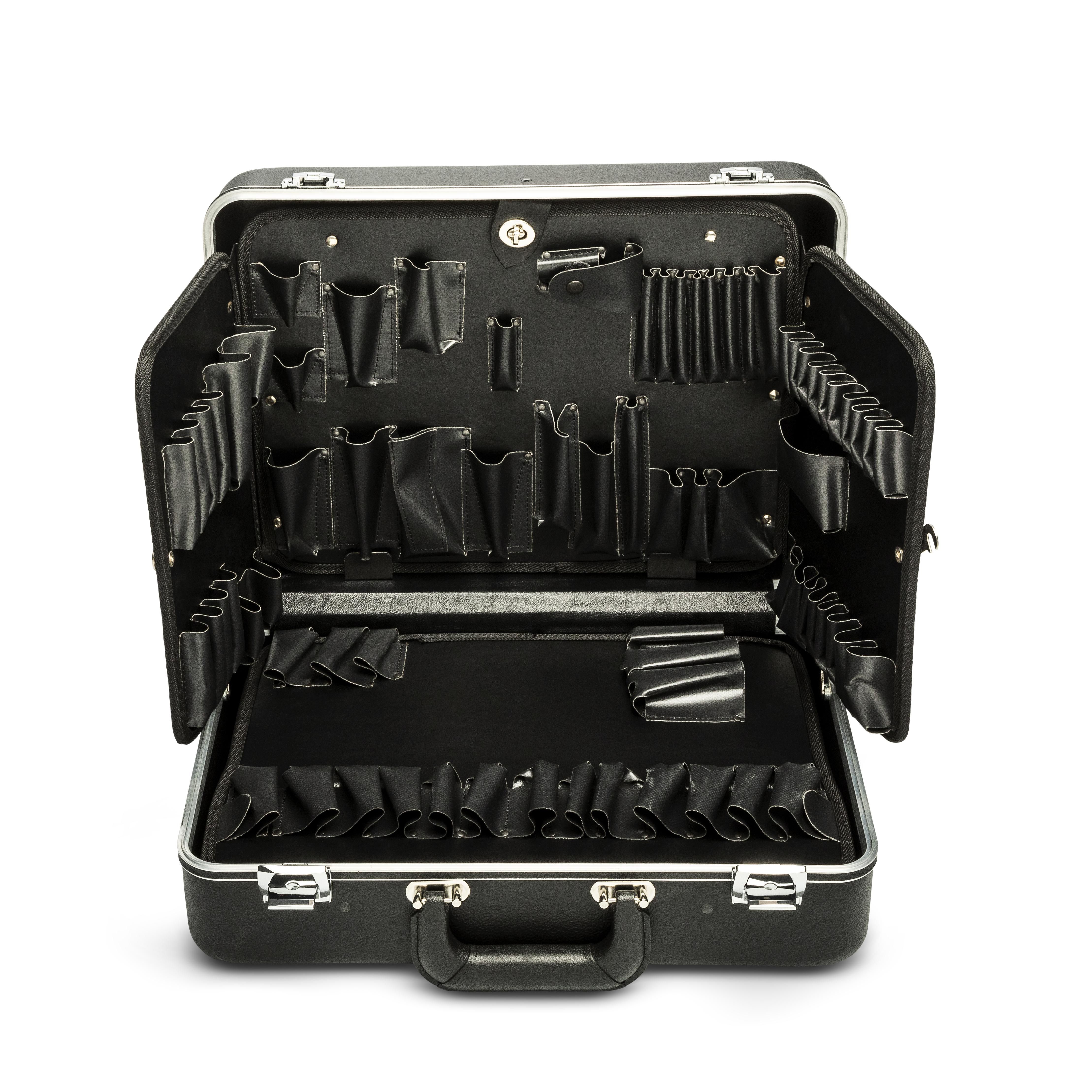 Contains 3-panel hinged tool pallet in lid plus additional pallet in bottom
