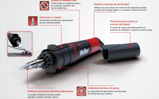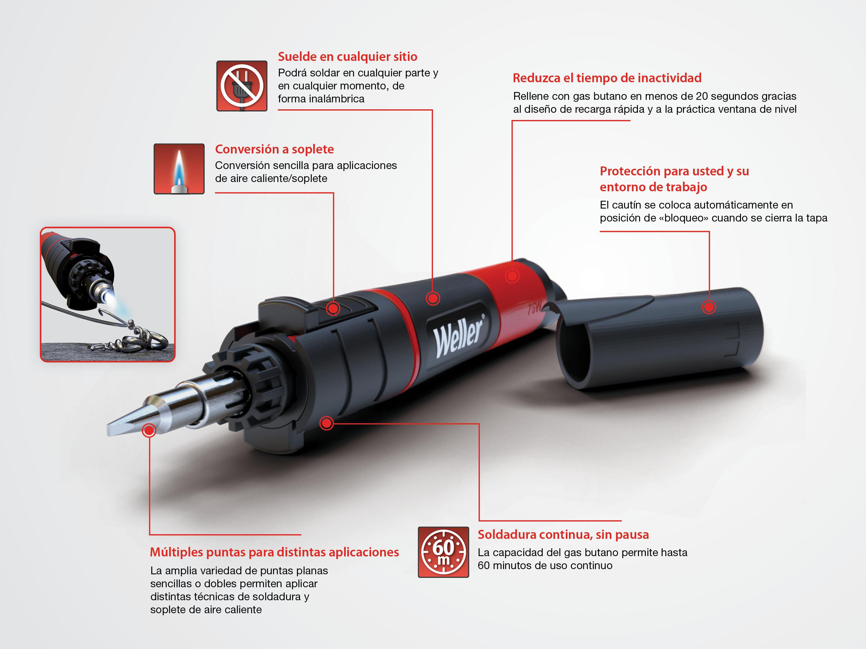 Suelde sobre la marcha con el soldador y herramienta térmica de Weller. El soldador de butano de 25 W-75 W proporciona una soldadura continua sin interrupciones. Con recargas de butano rápidas y fáciles, una amplia gama de puntas, apagado automático y la capacidad de convertirlo para aplicaciones de aire caliente/soplete, es perfecto para sus tareas de soldadura.